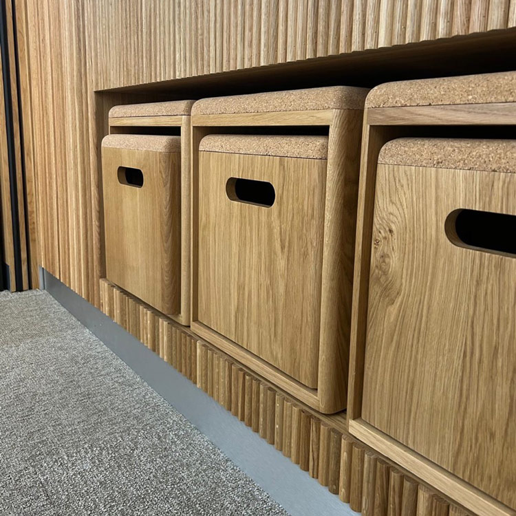 Bureau durable. Mobilier sur-mesure avec tissu recyclé sur structure bois. Collaboration avec un cabinet d’architectes + fabrication + pose.
