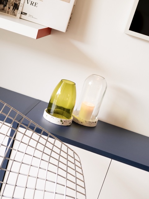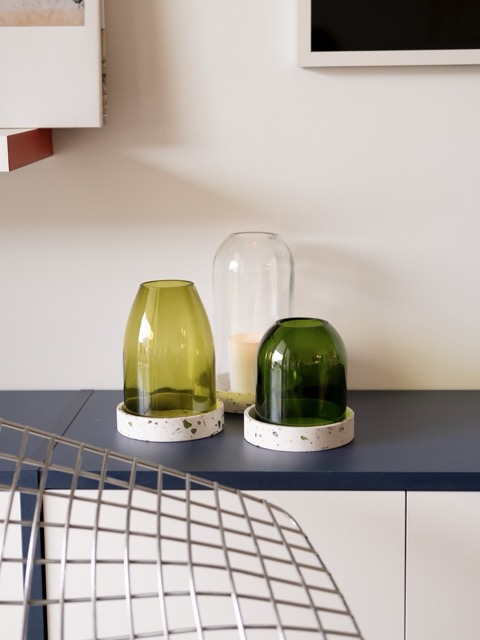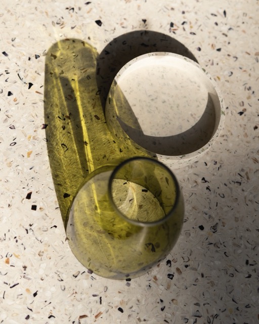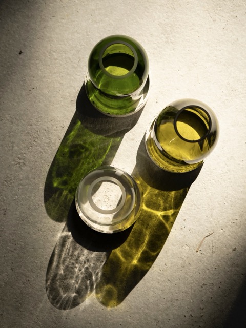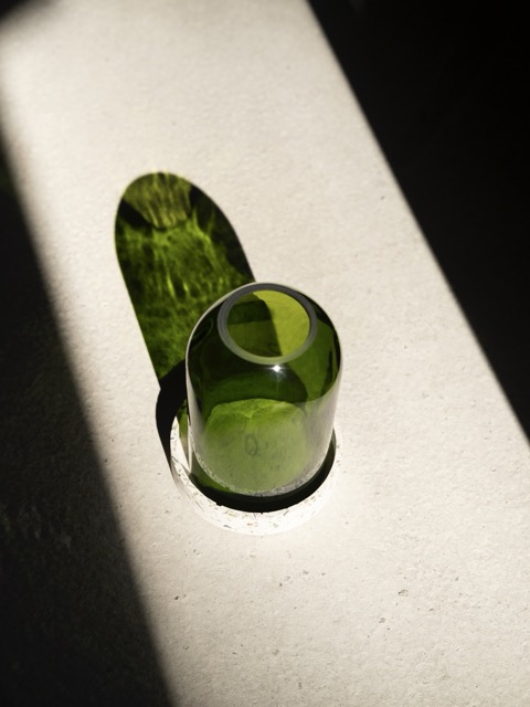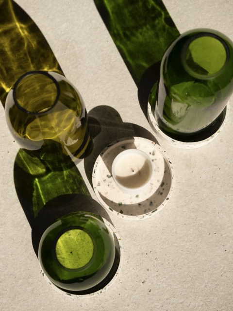 Le socle du photophore est réalisé à partir de coquilles d’huîtres broyées et d’éclats de verre, issus des chutes de production de Q de Bouteilles. La cloche en verre est, quant à elle, façonnée à partir d’une bouteille magnum recyclée.