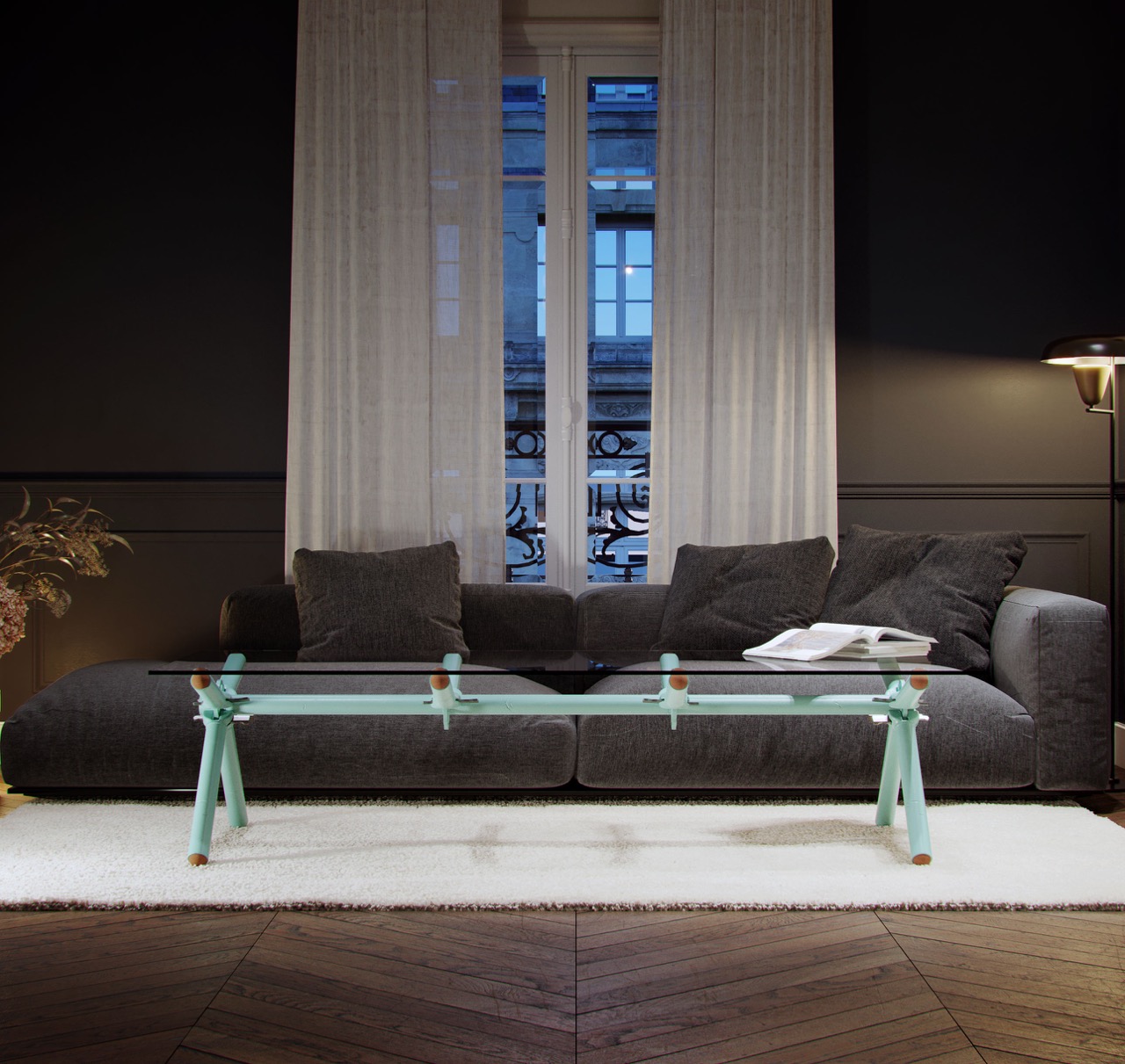 Le liège utilisé pour finir l’extrémité des tubes d’échafaudages est issu de bouchons de vin broyés. Le plateau de verre est simplement posé dessus et c’est juste ce qu’il faut pour ne pas qu’il glisse.